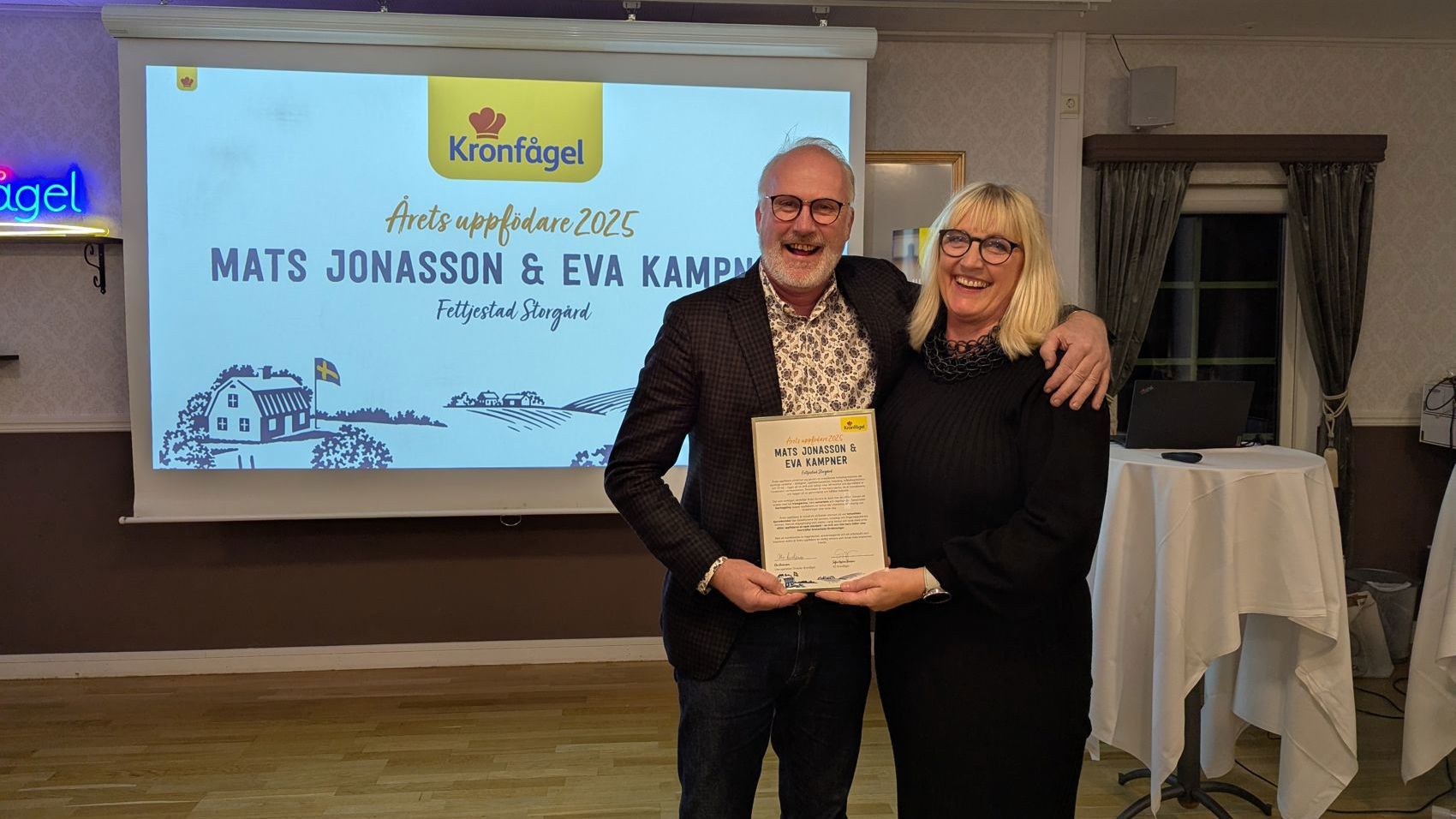 Kronfågel har utsett Mats Jonasson och Eva Kampner på Fettjestad Storgård till Årets Uppfödare. Utmärkelsen går till en uppfödare som genom konsekvent höga resultat, starkt djurvälfärdsfokus och ett systematiskt förbättringsarbete bidrar till utvecklingen av svensk kycklinguppfödning.