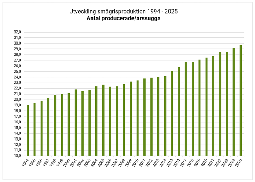 Antal producerade grisar per årssugga år 2025 var 29,7 och har ökat med 0,5 grisar sedan 2024. Levande födda grisar per kull ökade med 0,1 grisar till 16,0 och antal avvanda per kull ökade med 0,2 grisar till 13,5. De 25 % bästa besättningarna hade 33,0 producerade grisar per årssugga, 16,1 levande födda grisar per kull och 14,1 avvanda grisar per kull. Resultaten visar även detta år att större besättningar (fler än 400 suggor) har något bättre siffror jämfört med besättningar i alla storlekar.