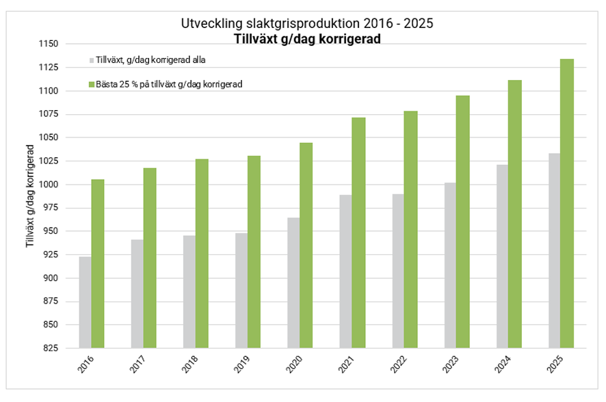 Den dagliga tillväxthastigheten för slaktgrisar var 1033 g och har ökat 12 g/dag sedan 2024. Slaktgrisarnas foderomvandlingsförmåga var 24,2 MJ NE, vilket är 0,3 MJ NE lägre än tidigare år. I de 25 % av omgångarna med bäst tillväxthastighet växte grisarna 1134 g/dag och omgångarna med bäst foderomvandlingsförmåga använde 22,4 MJ NE/kg tillväxt för slaktgrisarna.