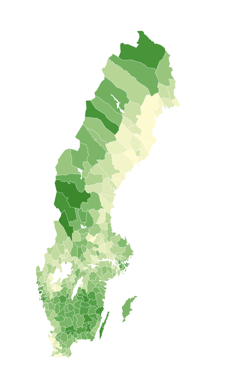 Siffrorna kommer från Jordbruksverket och kartan nedan visar andelen betesmark i procent av den totala jordbruksmarken. Ljust mindre och mörkare grönt större.