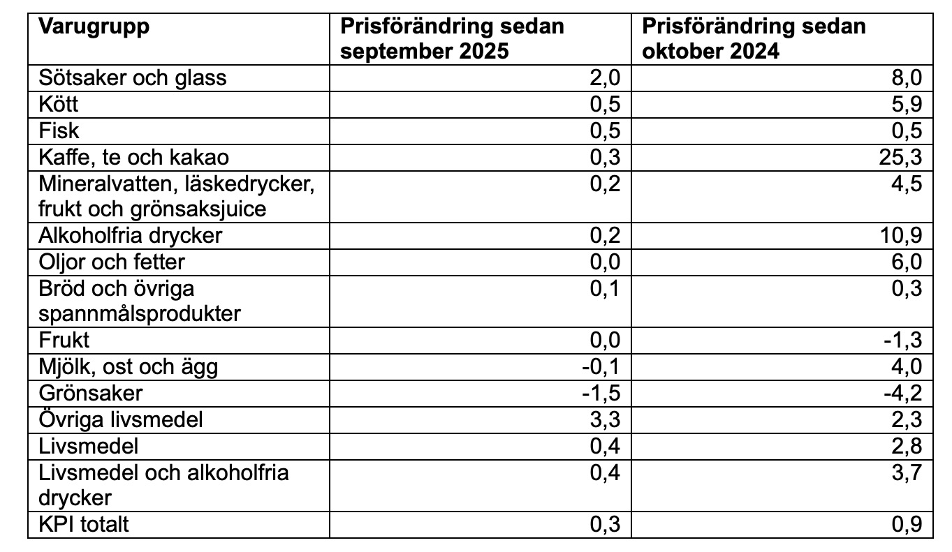 Priserna på livsmedel och alkoholfria drycker steg med 0,4 procent i oktober jämfört med september. Från oktober 2024 till oktober i år har priserna stigit med 3,7 procent.