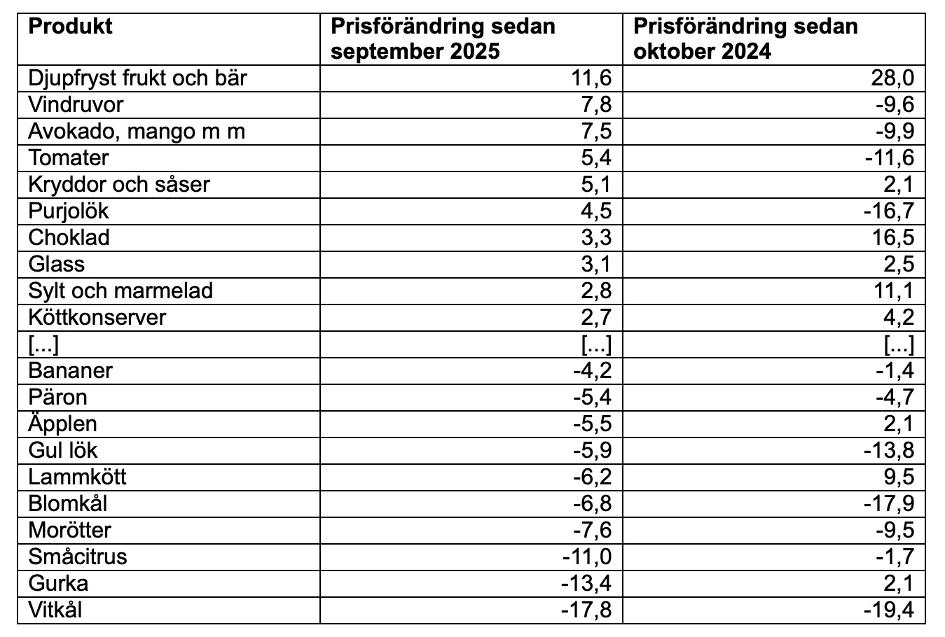 Ser man på prisutvecklingen under ett år har flera varor blivit rejält dyrare. Ett exempel är choklad, vars pris fortfarande låg 16,5 procent högre jämfört med oktober i fjol. Djupfrysta frukter och bär var 28 procent dyrare jämfört med läget för ett år sedan.
