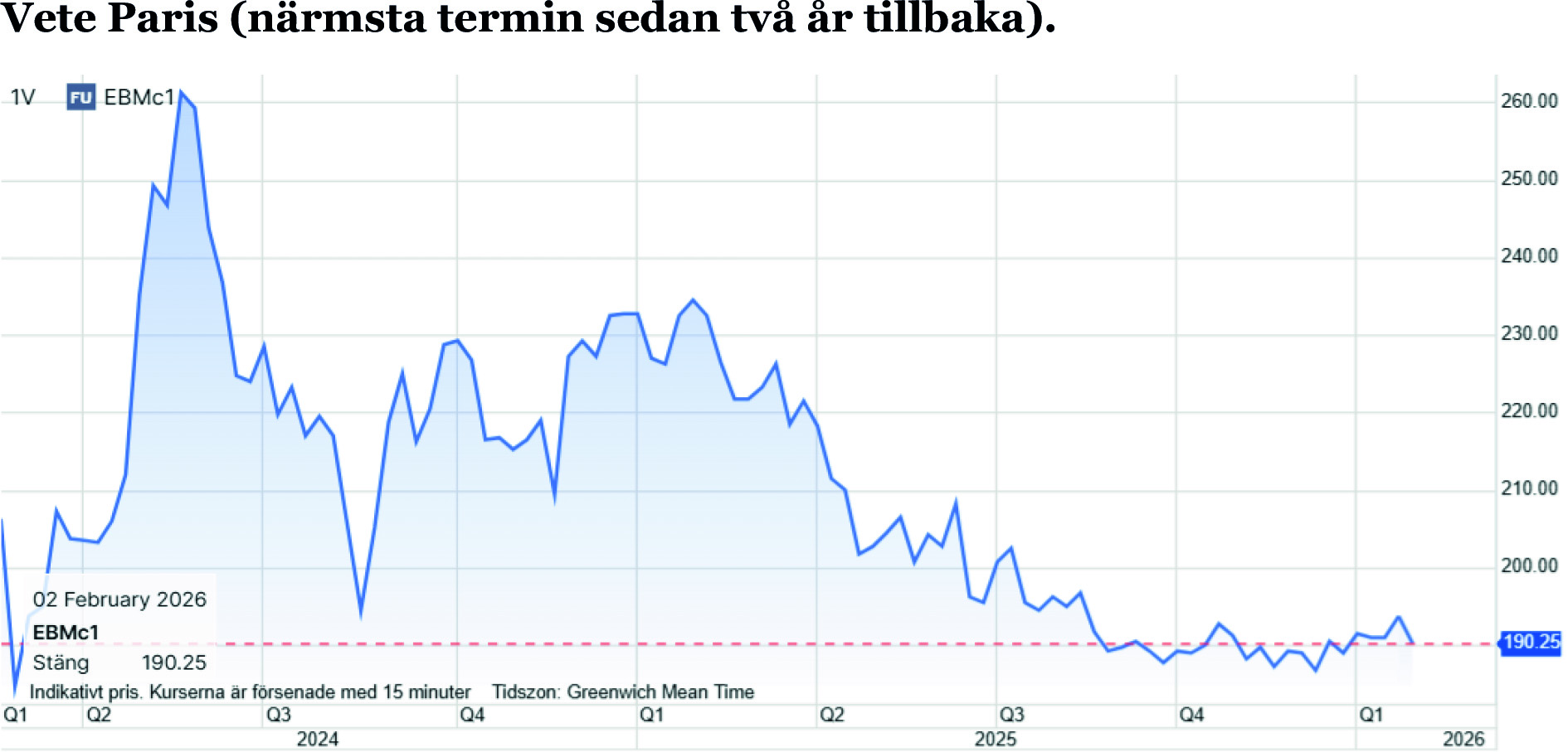 Att marknaden är lite osäker syns på prisrörelserna. För en vecka sedan kostade vete på Matif i närmsta termin 194,25 euro per ton. I början av denna veckan steg priset och toppade på 195 euro per ton för att sedan falla tillbaka i slutet av denna veckan.
