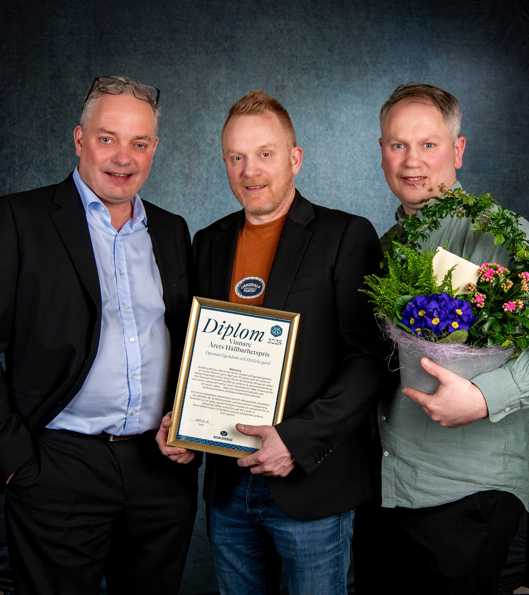 Scan Sveriges Hållbarhetspris 2025 tilldelas bröderna Mathias, Gabriel och Henrik Jonsson på Ogestad Egendom och Hyllela gård. De får utmärkelsen för sitt drivna hållbarhetsarbete, där de har lyckats vända ett hållbarhetsproblem till en resurs – och för ett mycket väl fungerande samarbete med Scan Sverige.
