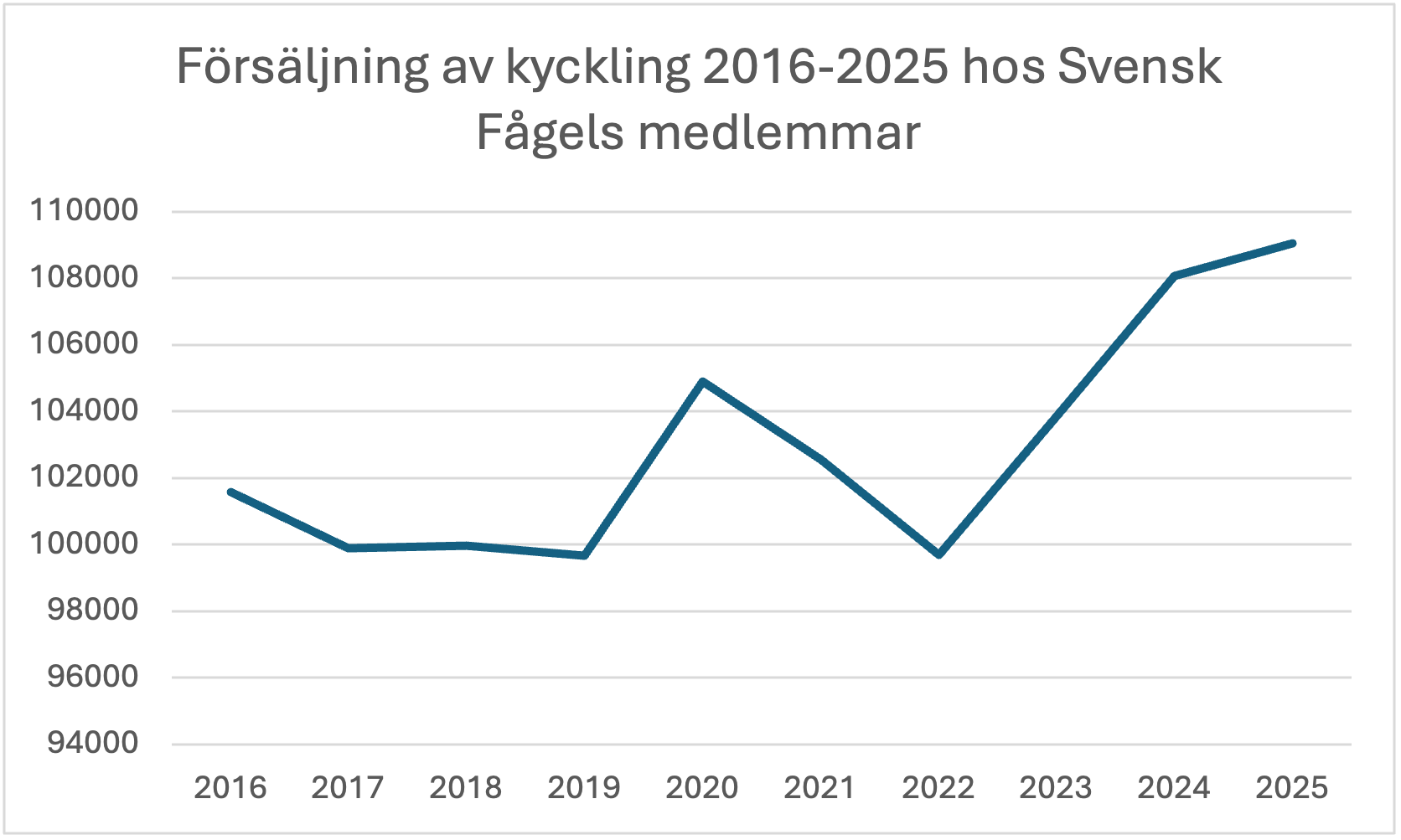 Bland medlemsföretagen i branschorganisationen Svensk Fågel, som står för 99 procent av den svenska kycklingproduktionen, ökade produktionen med 3 procent under året och är en toppnotering. Det har aldrig producerats så mycket kyckling i Sverige. På längre sikt är utvecklingen ännu tydligare: den svenska kycklingproduktionen har på tio år ökat med 23 procent.