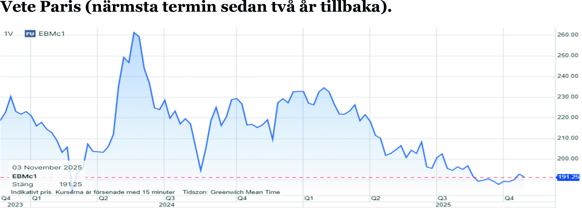 På Matif i Paris gick vete ner med 0,8 procent, majs gick upp lika mycket medan raps gick ner med 0,4 procent.
