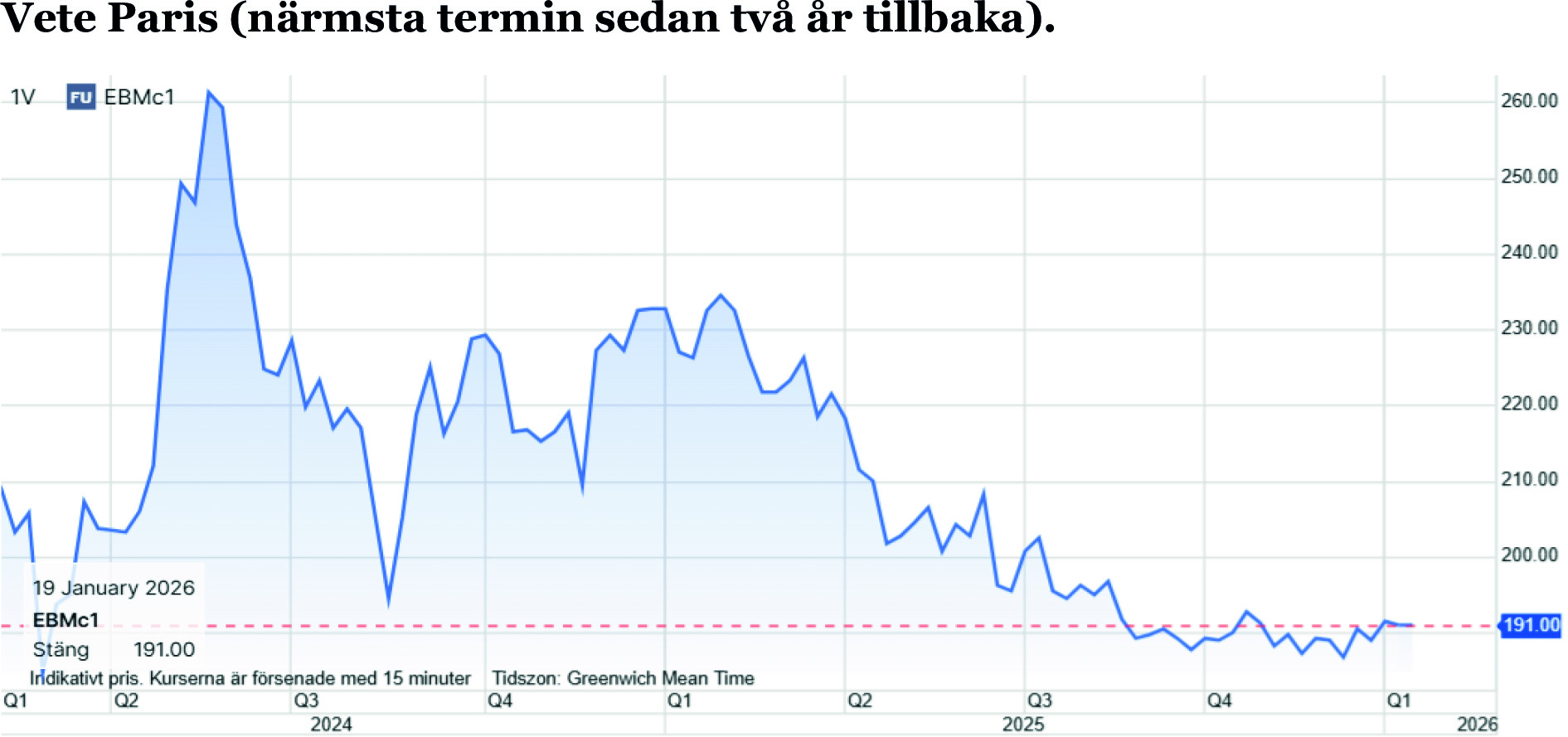 I USA är det dåligt med snötäcke i vissa regioner med mycket höstvete och nu är man orolig för utvintring när det blir kallt. Även det är en anledning till att vete stiger lite mer på Chicago Board of Trade jämfört med Matif i Paris.