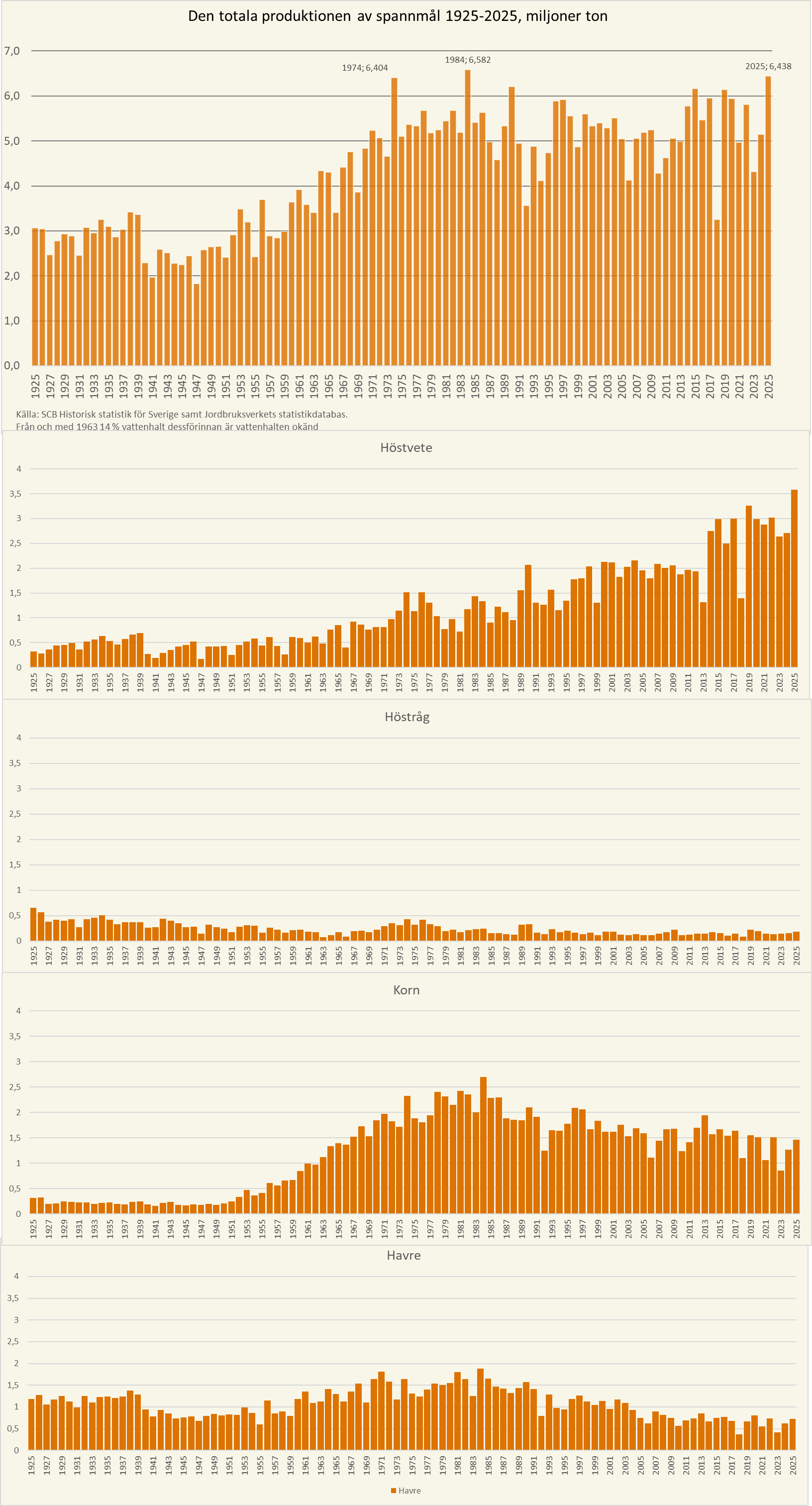 Idag har Jordbruksveret publicerat den slutliga statistiken för skördar av spannmål, oljeväxter, trindsäd och vallfrö för år 2025. Rapporten visar att den totala spannmålsskörden uppgick till 6,4 miljoner ton under 2025, vilket tillsammans med år 1974 är den näst största spannmålsskörden som uppmätts, efter toppnoteringen från år 1984. År 2025 blev skörden även en fjärdedel större än föregående år och 23 procent större än är genomsnittsskörden för de fem senaste åren.