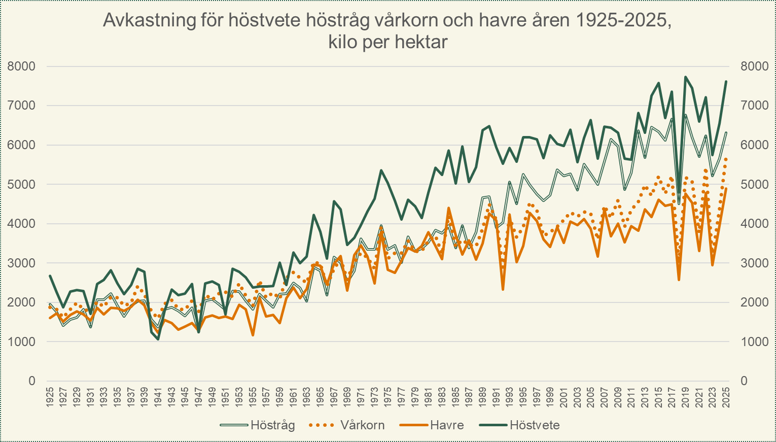 Stora avkastningsnivåer uppmättes i hela riket under år 2025. Hektarskörden av vårkorn, den vanligaste vårsådda spannmålsgrödan som odlas i hela Sverige, blev 5 690 kilo per hektar på riksnivå under år 2025 vilket är den största noteringen någonsin. I tio län var hektarskördarna av vårkorn de största som noterats, framför allt i Götaland och Svealand. Jämtlands län var det enda län där avkastningen av vårkorn blev mindre än femårsgenomsnittet. Hektarskörden av höstvete blev 7 610 kilo per hektar på riksnivå, vilket är 13 procent större än femårsgenomsnittet.