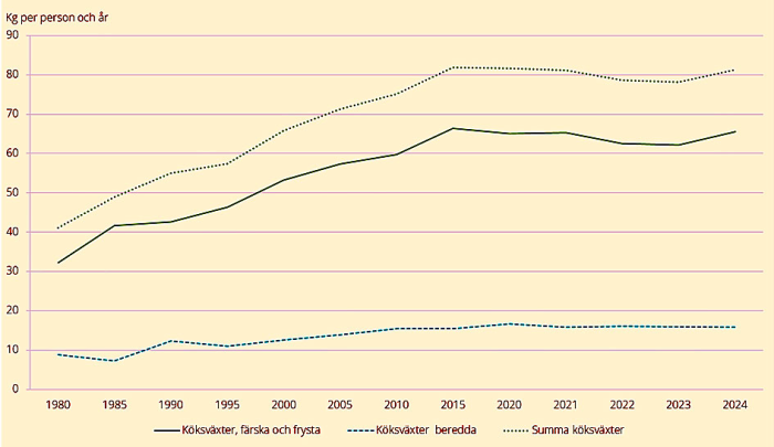Statistiken visar att totalkonsumtionen av köksväxter, som exempelvis morötter, tomater och inlagd gurka, har fördubblats sedan 1980 till 81 kg per person 2024. Främst har konsumtionsökningen varit stor för färska och frysta köksväxter, från 32 till 66 kg per person.