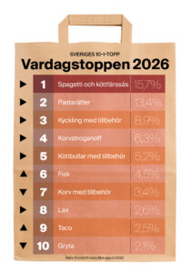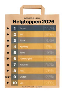 På tallriken är förändringarna små. Spaghetti och köttfärssås behåller sin position som svenskarnas favorit till vardags, medan tacos fortsätter dominera helgen, nu på rekordnivån 14,7 procent. Dessutom breddas helgmenyn, där fler rätter konkurrerar bakom toppen.