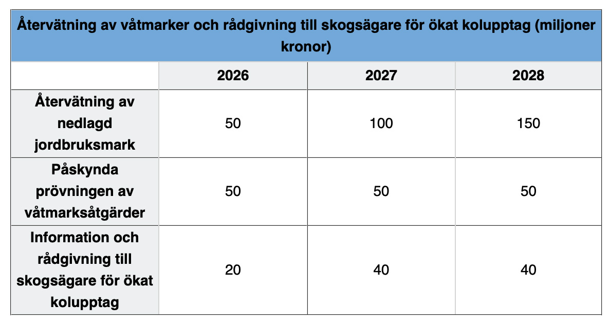 I budgetpropositionen för 2026 presenterar regeringen tre nya satsningar på totalt 120 miljoner kronor för att öka kolinbindningen i skog och mark. Åtgärderna omfattar ett nytt stöd till återvätning av nedlagd jordbruksmark, utökade medel för att påskynda prövningen av våtmarksåtgärder och rådgivningsinsatser till skogsägare.